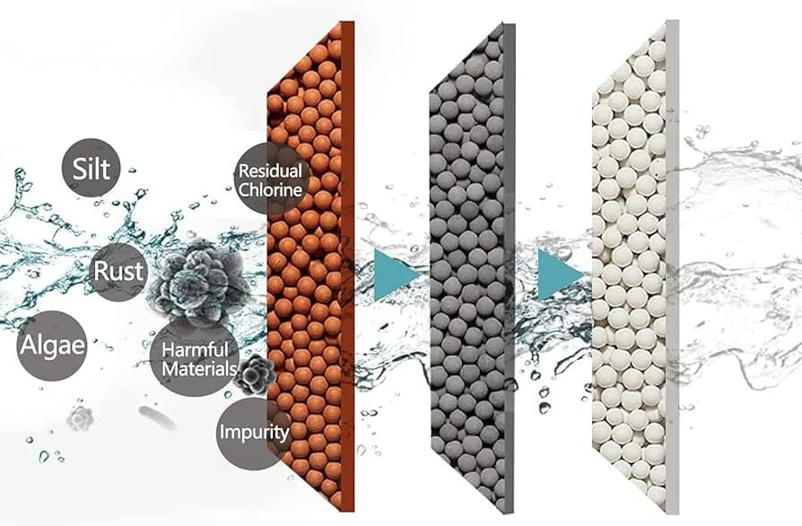 Built-in mineral stones help reduce chlorine and other impurities for cleaner water, healthier skin, and softer hair.